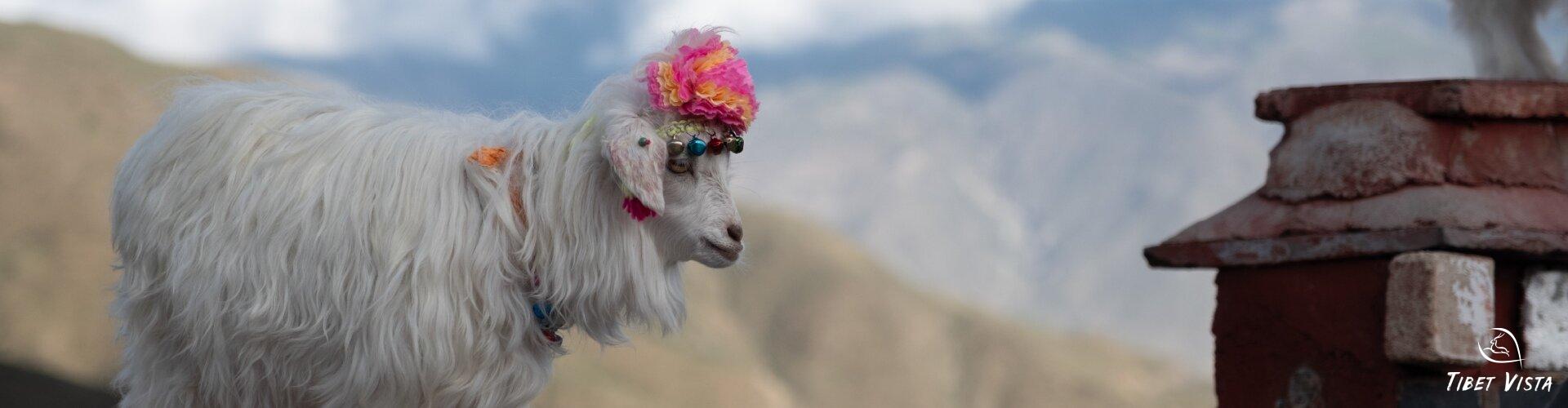 Adorable lamb with a colorful headpiece, ready for photoshoots around Yamdrok Lake.Take the scenic Tibet train from Chengdu to Lhasa and explore Mount Everest's majestic beauty.